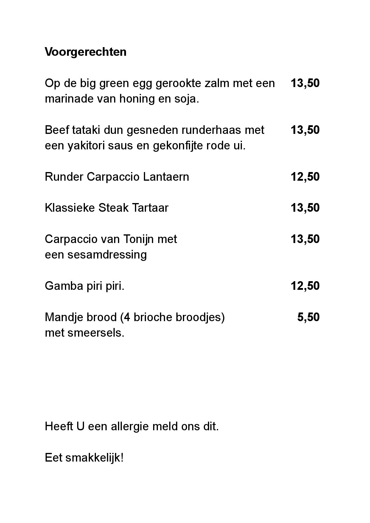Heeft u een verzoek, zoals vegetarisch dan is dit natuurlijk mogelijk,geef dit aan bij u reservering en wij maken dit voor u klaar. Zo ook eigen suggesties zijn welkom. Graag 1of 2 dagen van te voren in verband met de boodschappen.